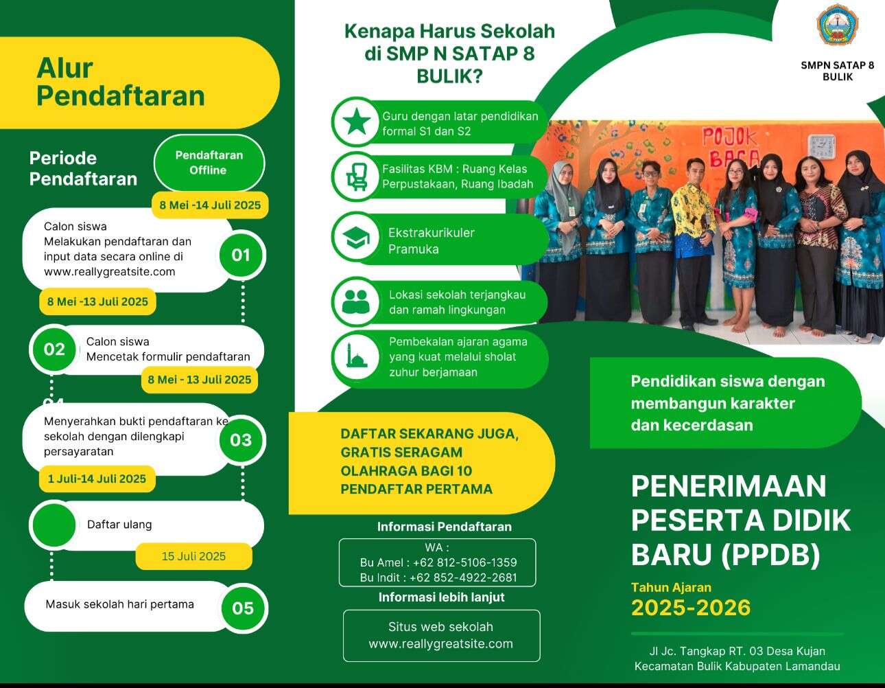 Ayo bersekolah di SMPN Satu Atap 8 Bulik, Daftarkan dirimu sekarang juga. 10 Pendaftar Pertama mendapatkan satu stel seragam olahraga gratis.